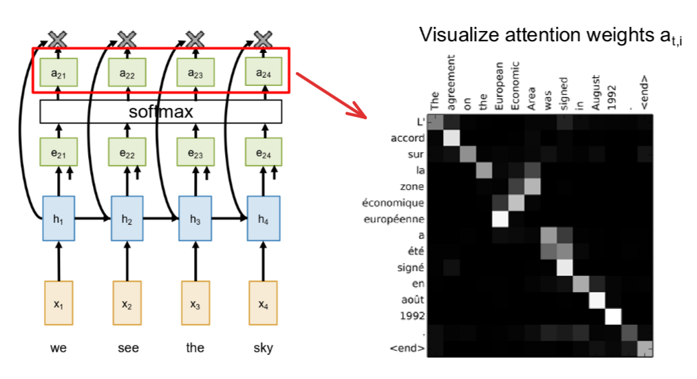 So here’s a famous visualization from that original Bahdanau attention paper. What they did was train an English-to-French translation model and then plotted the attention weights, ati, for a given sentence. What you’re looking at here is a matrix. The brightness of the pixel at position (i, j) tells you the strength of the attention weight. So, a bright pixel means that when the model was generating output word j, it was paying a lot of attention to input word i. Let’s look at the specific example here. The input sentence in English is: “The agreement on the European Economic Area was signed in August 1992.” And the model correctly translates this to the French output: “L’accord sur la zone économique européenne a été signé en août 1992.” Now, if you look at the structure of this attention map, you can see some really interesting patterns. For large parts of the sentence, the attention is strongly diagonal. You can see that when the model generates “L’accord,” it’s paying strong attention to “The agreement.” When it generates “sur la,” it’s looking at “on the.” Down at the end, when it generates “signé en août 1992,” it’s looking at “signed in August 1992.” This makes perfect sense because, for these parts of the sentence, the word order between English and French is pretty much the same. This diagonal alignment is a great sanity check; it shows us that the model has learned a very sensible, monotonic alignment between the two languages. But here’s where it gets really cool. Look at the part of the sentence that translates “European Economic Area.” In French, the word order is flipped: “zone économique européenne.” And look what the model does! The attention map is no longer diagonal here. When it generates the word “économique,” you can see a bright spot where it’s attending to the English word “Economic.” But then, when it generates the next word, “européenne,” it correctly looks back to the word “European” in the input. This is really powerful. It shows that the model isn’t just doing a simple, one-to-one mapping. The attention mechanism has allowed it to learn these non-trivial, non-monotonic alignments between the source and target languages. It figures out these complex word re-orderings all on its own, just through backpropagation.