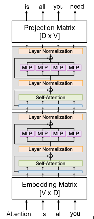 Our Transformer blocks operate on sets of vectors, but our input is text-a sequence of words or tokens. So, the very first layer of the model needs to convert these words into vectors. We do this with a learnable embedding matrix. If our vocabulary has V unique tokens and our model’s hidden dimension is D, then this is simply a lookup table of shape [V x D]. For each word in our input sequence, like “Attention,” “is,” “all,” “you,” we look up its corresponding D-dimensional vector in this table. These embedding vectors are initialized randomly and are learned just like all the other weights in the network through backpropagation. This gives us our initial set of input vectors to feed into the first Transformer block. And of course, we would also add our positional encodings to these vectors at this stage.