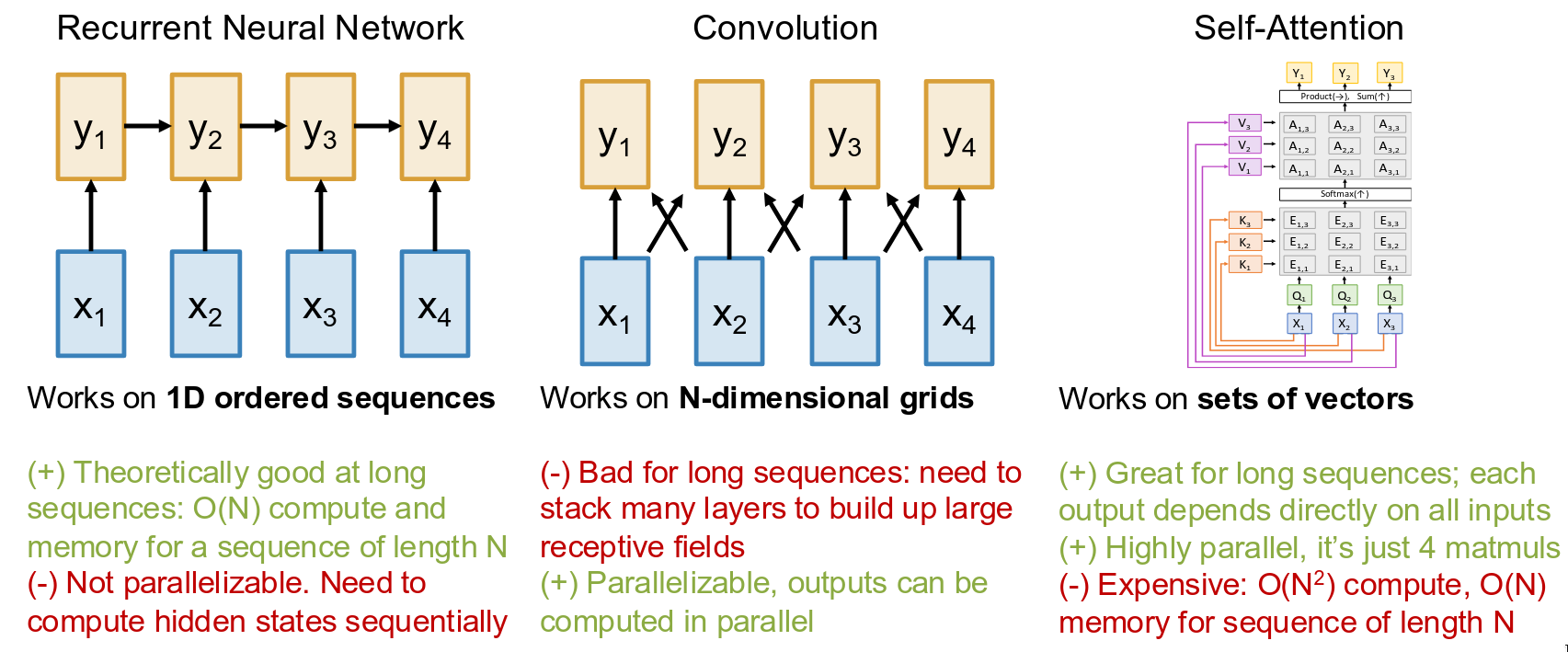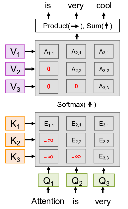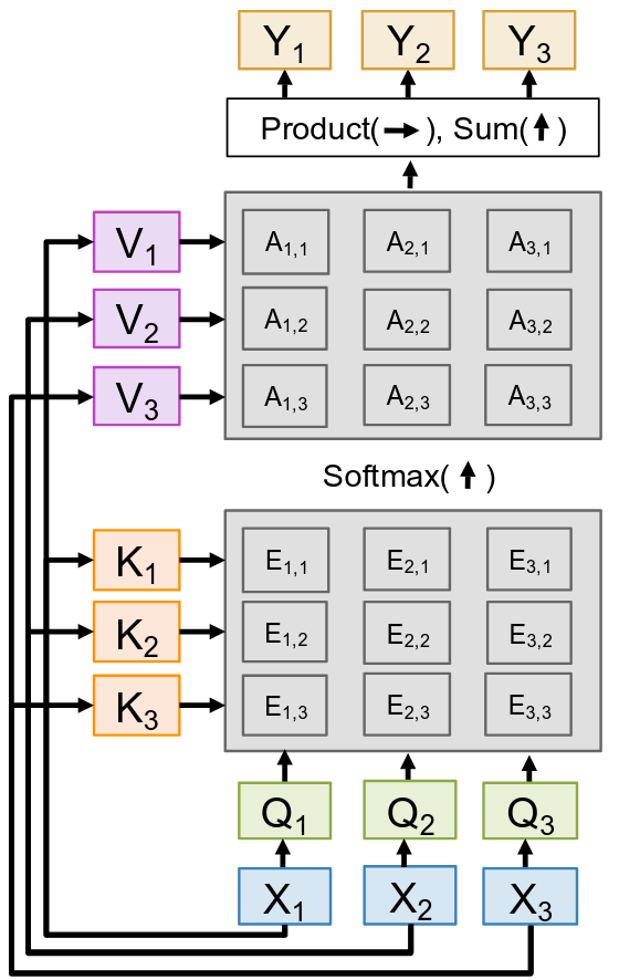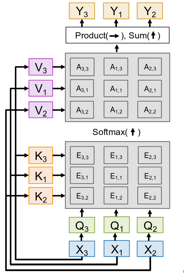 - Output vector: \(Y = AV\) [NQ x DV], \(Y_i = \sum_j A_{ij} V_j\)