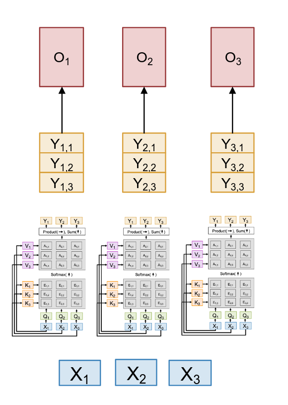 Okay, so we run our input X through these H parallel heads. What do we get? Well for each input token Xi, we now have H different output vector. As the diagram show, for input X1, we now have an input from head 1 (Y1,1), and output from head 2 (Y1,2), and an output from head 3 (Y1,3). So the next logical step is to gather these up. We can think of this as stacking or concatenating the independent outputs for each input position