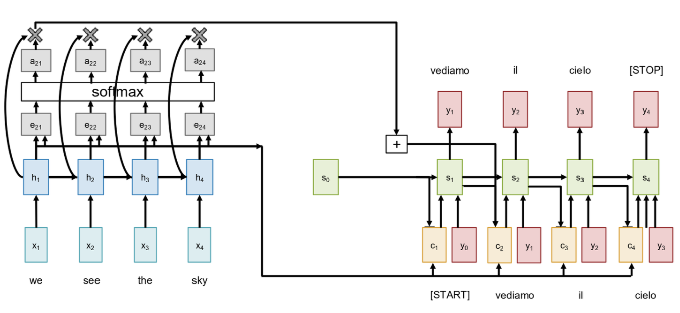 Now that we have this dynamically computed context vector c1, the rest of the decoder step proceeds much like before. We feed this new context vector c1 into our decoder RNN unit, along with the previous output y0 (the [START] token). The RNN then updates its hidden state from s0 to s1 and predicts the first output word, y1, which is “vediamo.” And the important thing to realize is that this whole process will repeat for the next step. To generate y2, we will first use the new decoder state s1 to re-calculate a whole new set of attention weights a2i, which gives us a new context vector c2, and so on. The context is no longer fixed, it’s recomputed for every single output token.