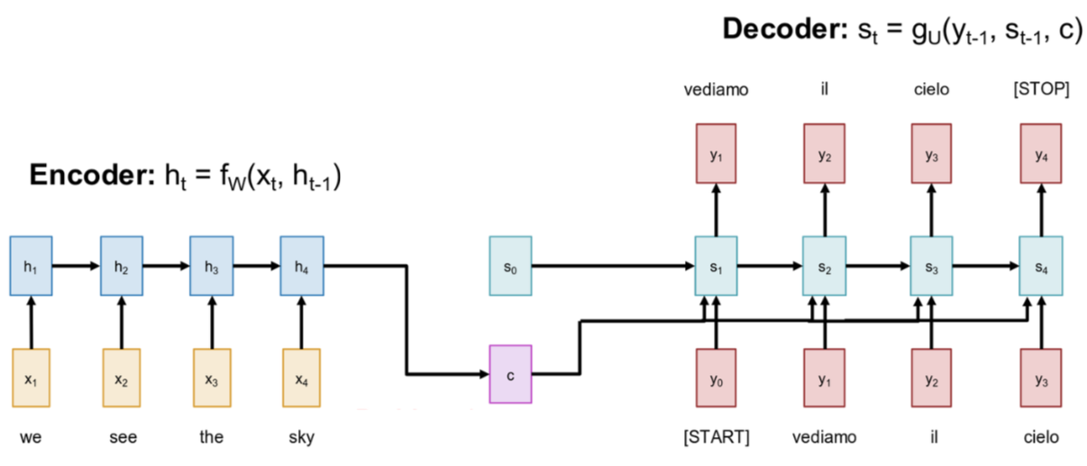 This brings us to the second half of the model, the Decoder. The decoder is another RNN, and its job is to take that context vector c and generate the output sequence, word by word. So how does it start? It’s initialized with hidden state s0 that we got from context vector. To kick of the generation process, we feed a special [START] token as its first input, which we call y0. The decoder RNN then process its state s0 and the input y0, and it produces two things: an output y1, which is the first word of our translated sentence, “vediamo,” and a new hidden state, s1. Notice that the context vector c is used as an input at every step of the decoder, constantly reminding it of the original sentence. Okay, so what happens at the next time step? This is where it gets interesting. The model operates in what’s called an “auto-regressive” fashion. That means the output from the previous step becomes the input for the current step. So, we take the word we just generated, “vediamo” (y1), and feed that back into the decoder as the input for the next time step. The decoder then takes its previous state s1 and this new input y1 to produce the next state s2 and the next output word, y2, which in this case is “il.” And this process just continues. We feed “il” back in as input, the decoder produces “cielo.” We feed “cielo” back in as input, and eventually, the decoder will produce a special [STOP] token, which tells us that the sentence is complete and we can stop the generation process.