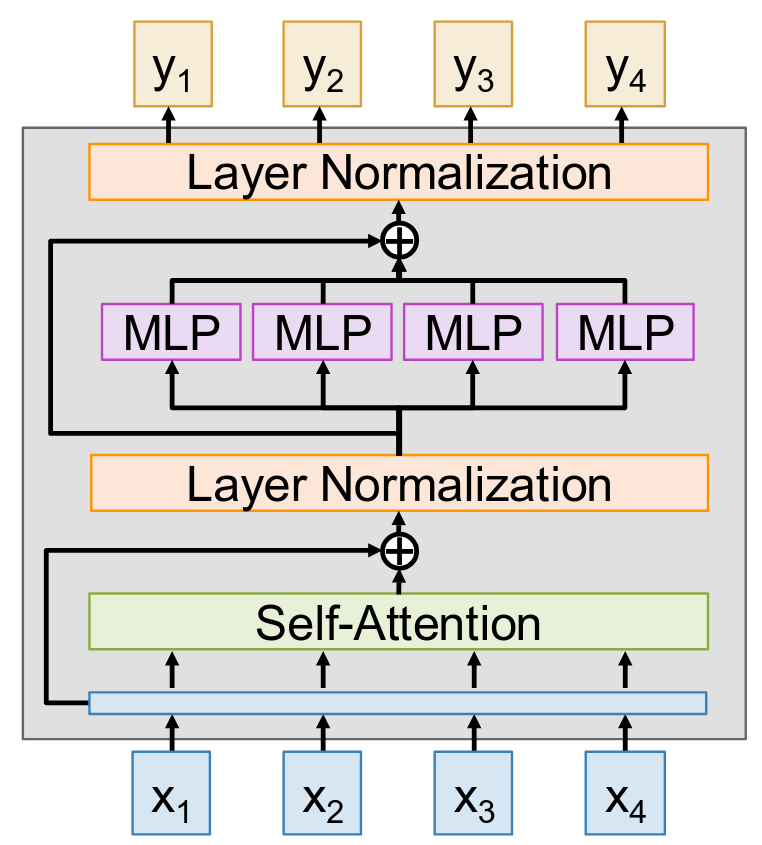 And what do you think comes after the MLP? You guessed it. Another residual connection. We take the input to the MLP block which was the output of the first layer norm and we add it to the output of the MLP. Again, this is crucial for building deep models. And finally, to finish off our Transformer block, we apply one more Layer Normalization step after that second residual connection. This produces the final output vectors y1 through y4 of our block.