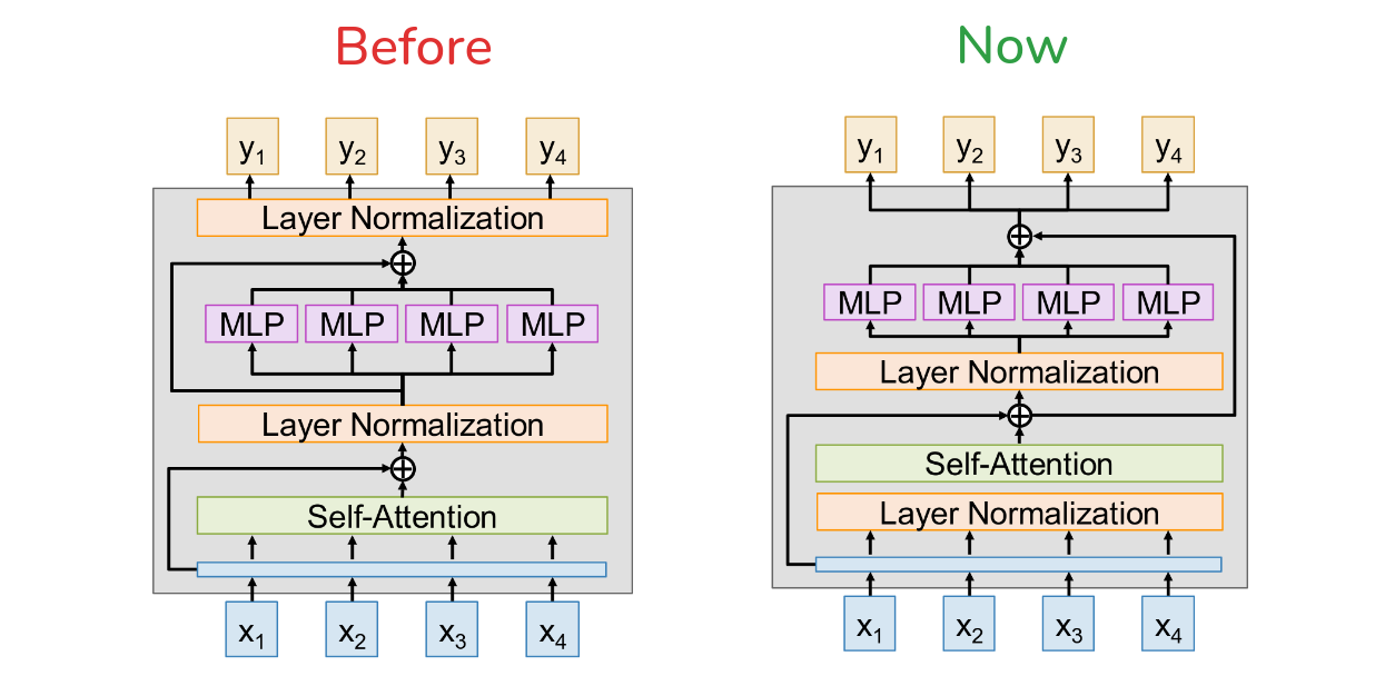 So let’s look at the original architecture from the “Attention is All You Need” paper, which is what’s shown here on the left. This is what’s known as a “Post-Norm” Transformer. And it has a kind of weird property if you look closely at the residual connections. The Layer normalization step happens outside the residual connection. It happens after you add the output of the self-attention block back to the input. Now, let’s do a little thought experiment. What’s the point of a residual connection? It’s to make it easy for a block to learn an identity function, so that we can stack many layers without performance degrading. So, what if our self-attention block learns to output all zeros? In a standard ResNet, the output of the block would be x + 0 = x. But here, the output is LayerNorm(x + 0), which is just LayerNorm(x). It’s not x. So, this architecture can’t actually learn a true identity function. The signal is always getting re-normalized. This can lead to some instabilities, especially at the beginning of training, as the gradients flowing back through the network can be a bit chaotic.